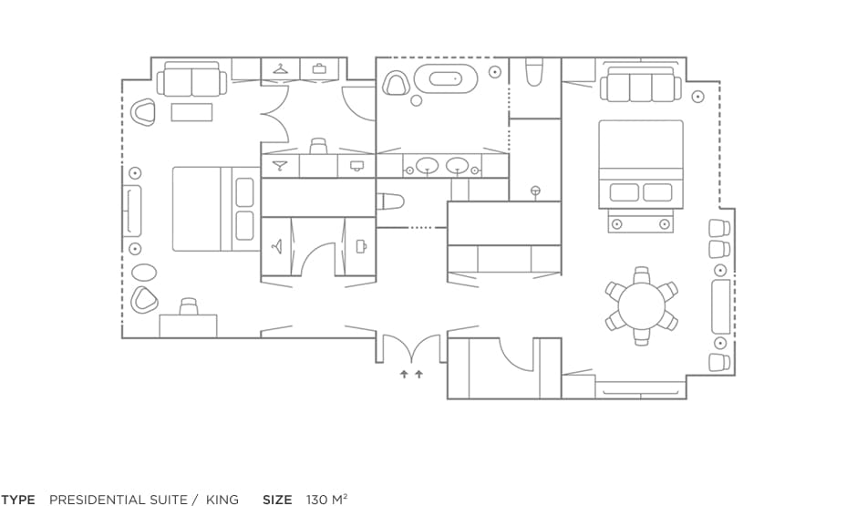 고풍스러운 응접실과 아늑한 침실, 드레스룸과 욕실, 게스트 화장실까지 완비된 프레지덴셜 스위트에서 클래식한 여유를 경험해 보세요.