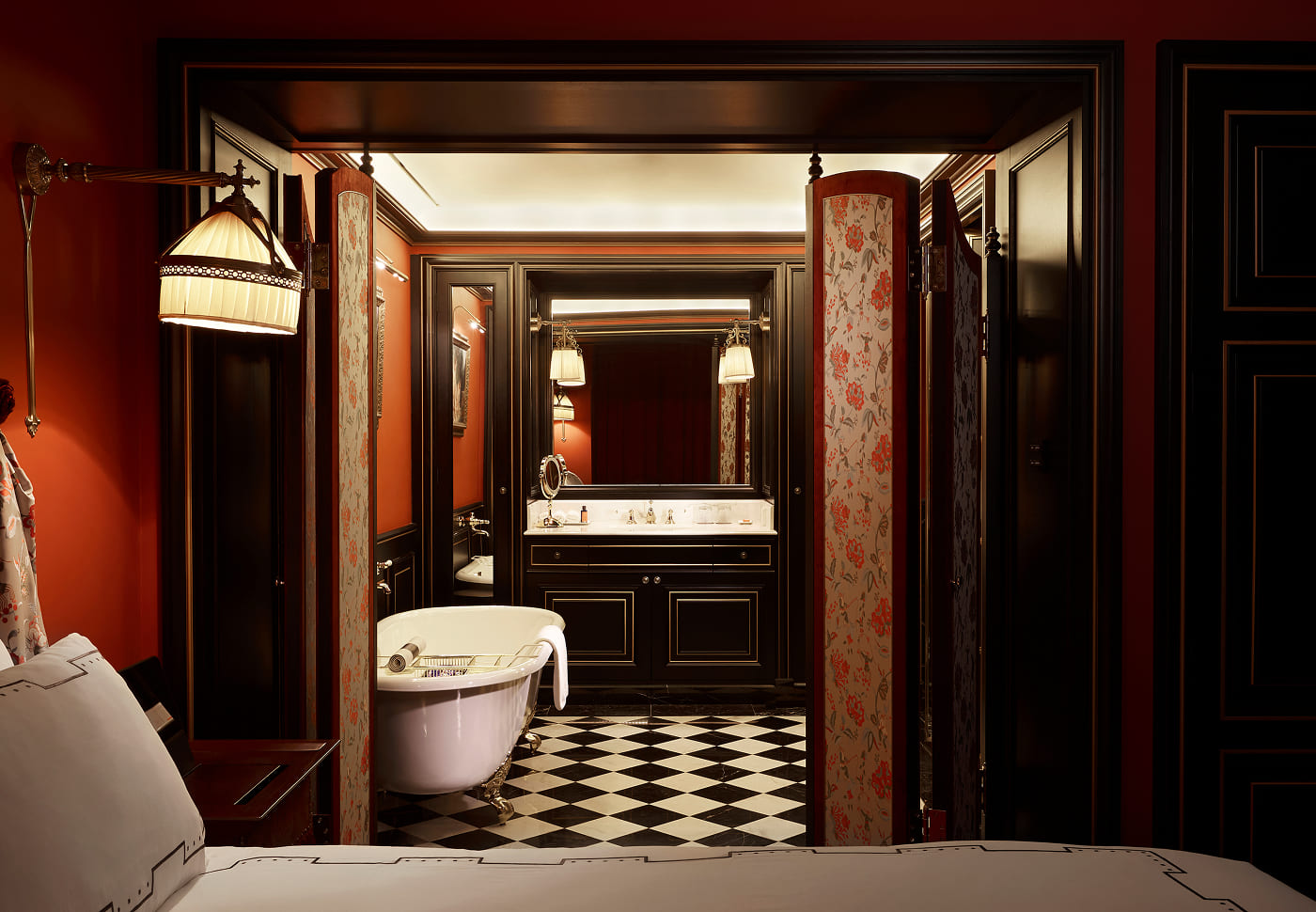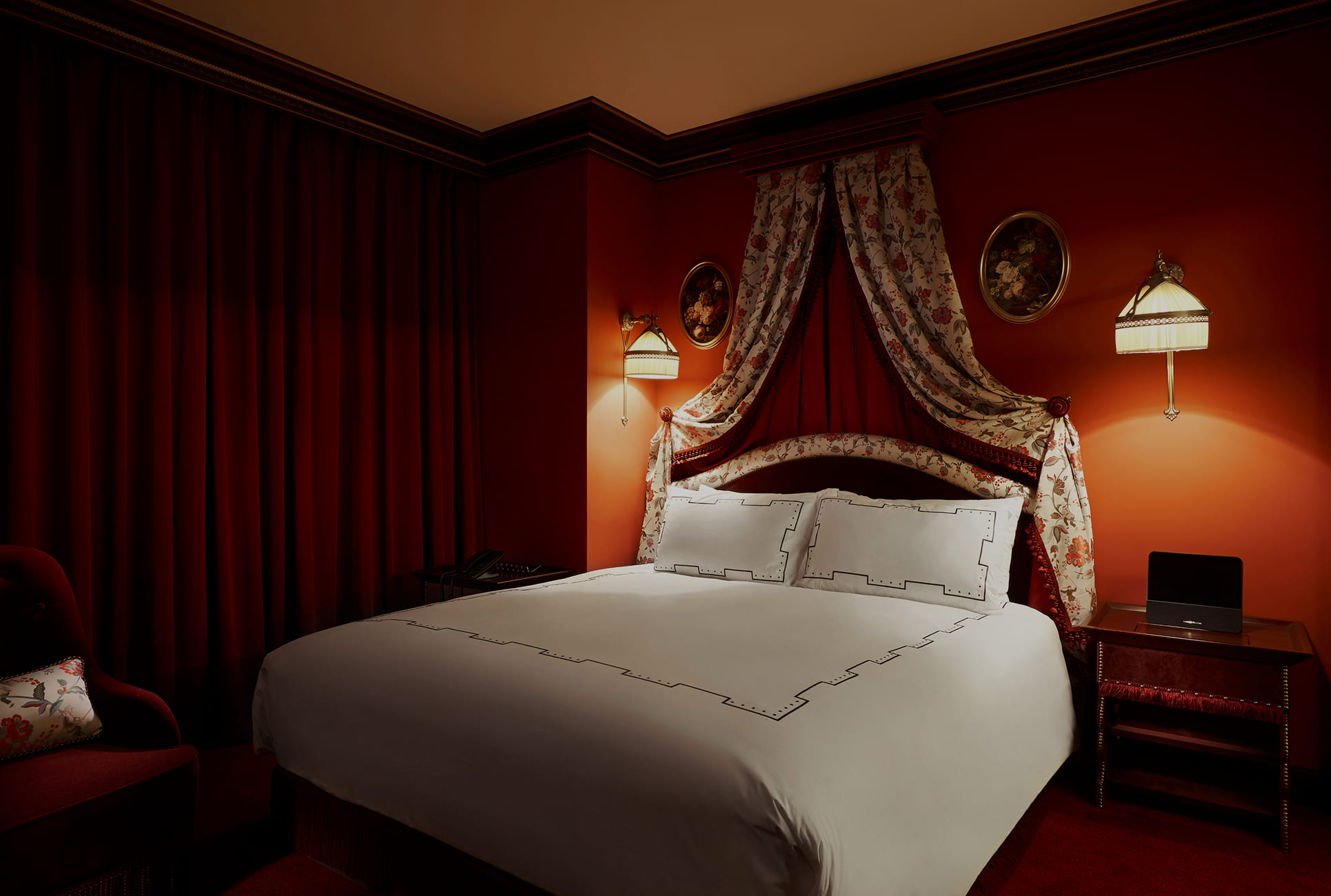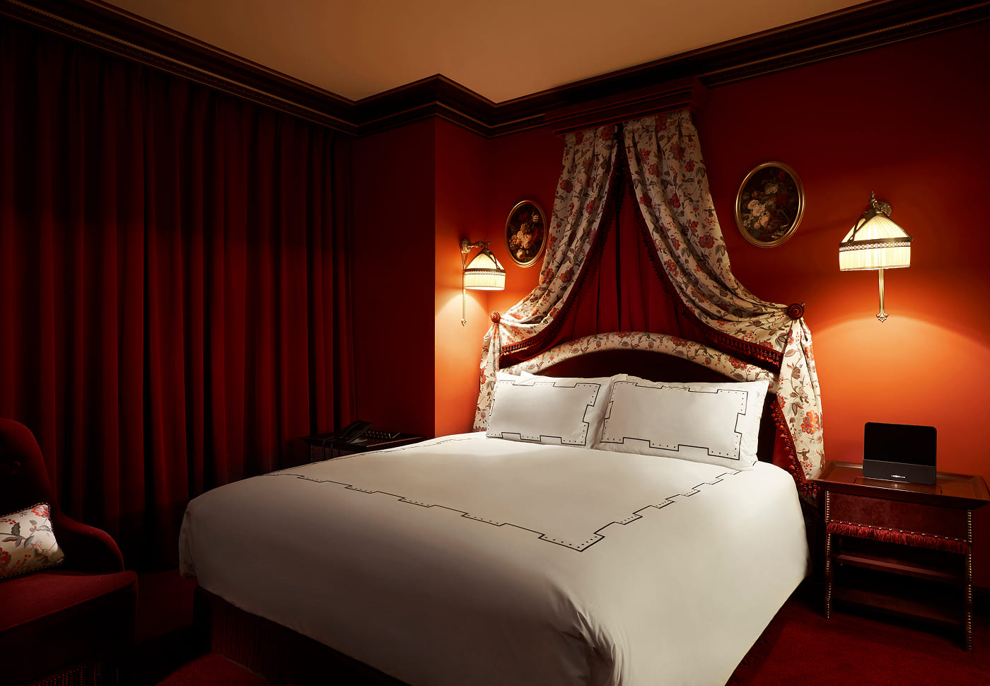 플라워 패턴의 캐노피 헤드보드와 로맨틱한 욕조가 어우러진 공간에서, 하루의 끝을 우아하게 마무리해 보세요.
